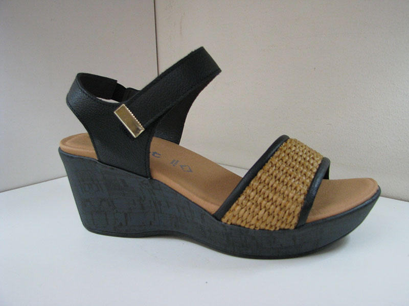 1 inch platform and 1.75 inch wedge heel. Sandal with adjustable Velcro strap. Rubber sole. European whole sizes. Medium widths. Tan raffia with black leather