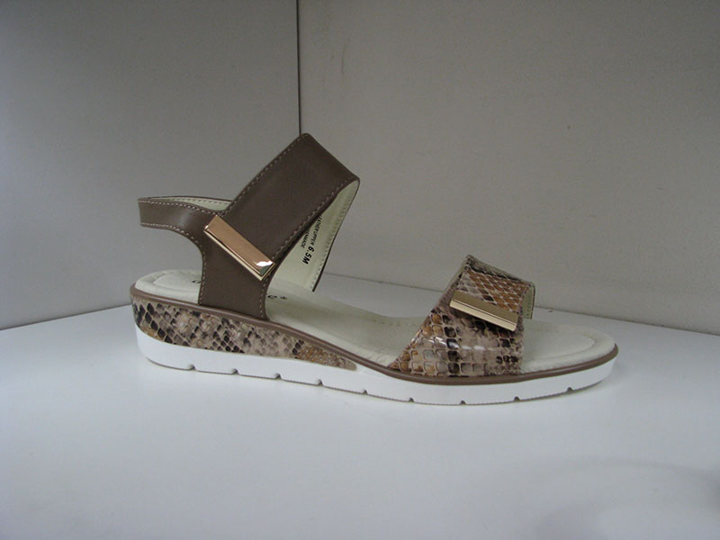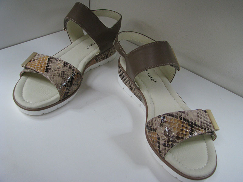 .75 inch wedge heel. Rubber sole. Adjustable Velcro straps. Cushion insole. Medium widths. Whole & half sizes. Tan multi snake.
