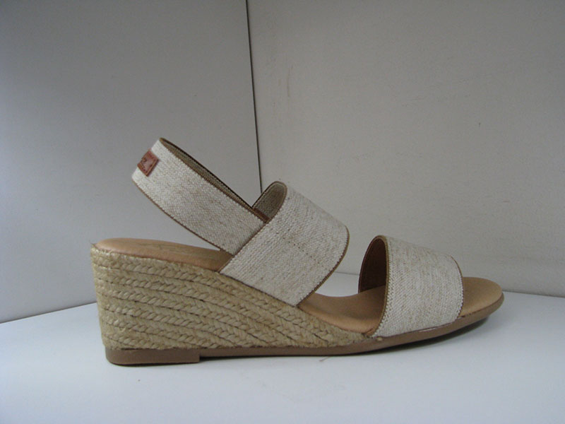 2 inch rope wedge heel. Rubber sole. Cushion insole. Elastic instep and heel strap. European whole sizes. Medium widths. Beige fabric.