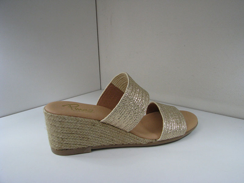 2 inch rope wedge heel. Rubber sole. Cushion insole. Open toe two strap slide. European whole sizes. Medium widths. Gold raffia.