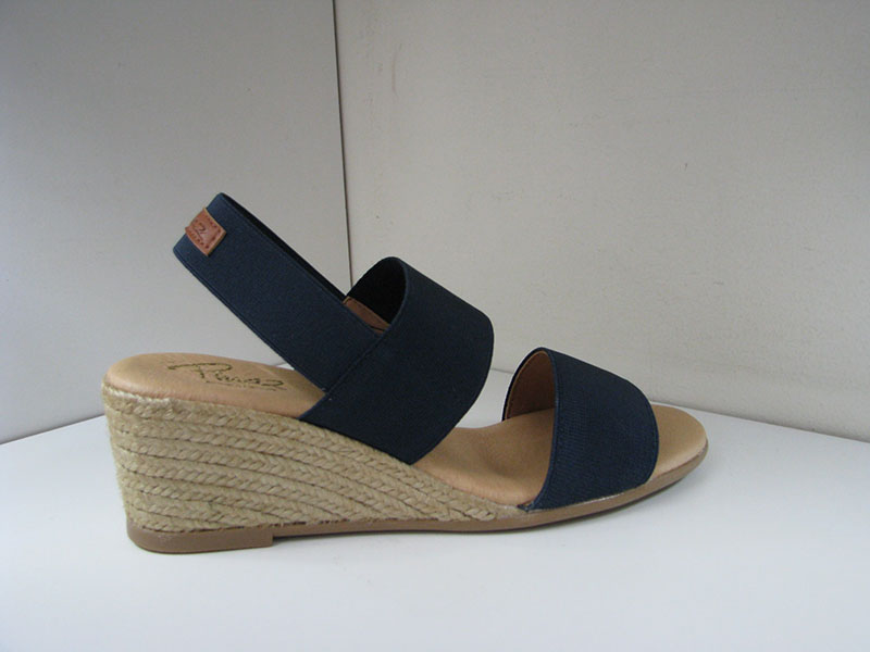 2 inch rope wedge heel. Rubber sole. Cushion insole. Elastic instep and heel strap. European whole sizes. Medium widths. Navy elastic.