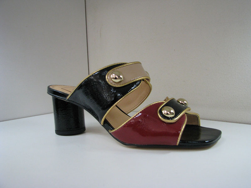 2 inch heel. Open toe slide. Non slip sole. Medium width. Whole sizes. Black tan and burgundy crinkle leather. Gold piping and buttons.