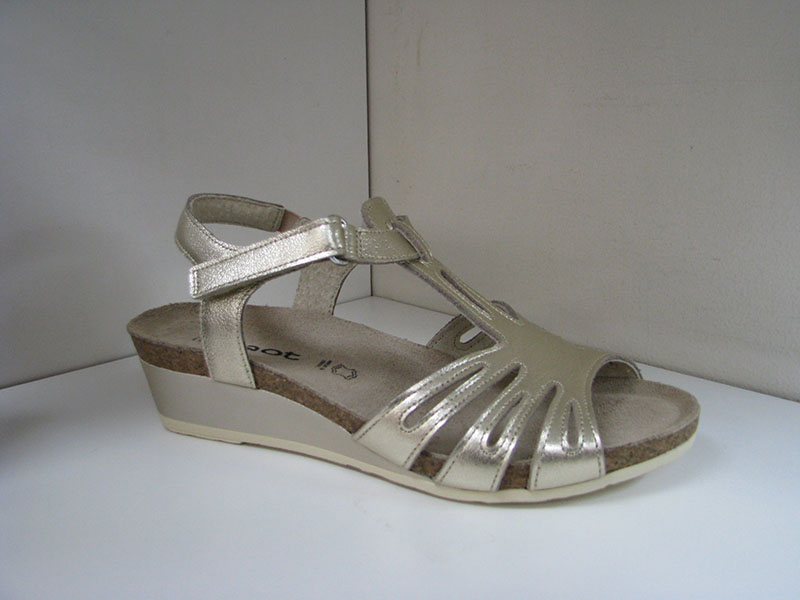 2 inch wedge heel. Arch support. Rubber sole. Adjustable Velcro strap. Comfort insole. European sizes. Medium width. Gold leather.