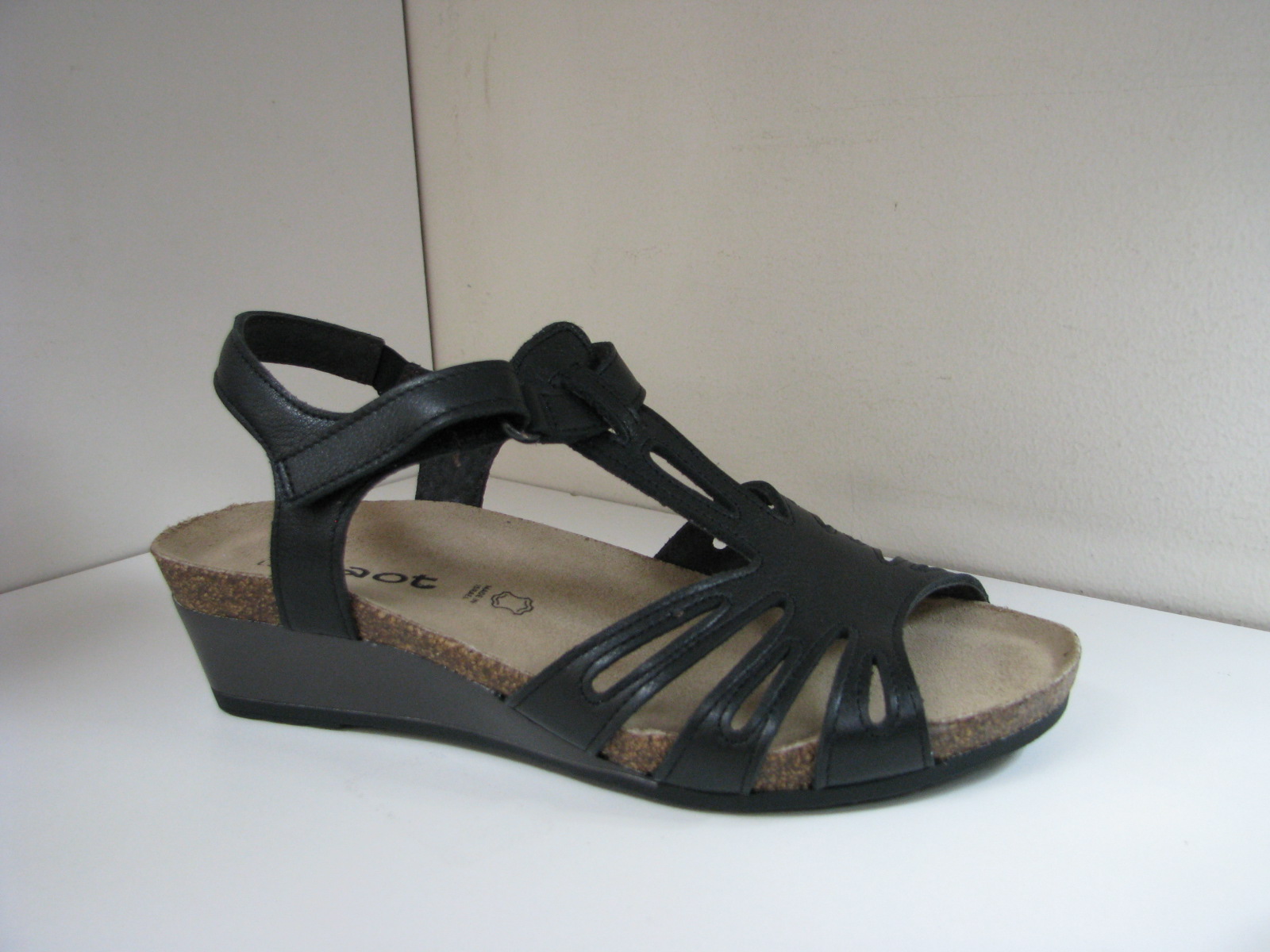 2 inch wedge heel. Arch support. Rubber sole. Adjustable Velcro strap. Comfort insole. European sizes. Medium widths. Black leather.