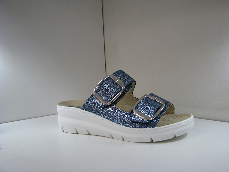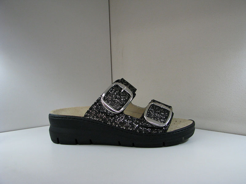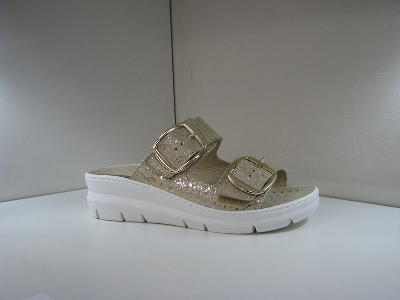 2 inch wedge heel. Suede comfort insole. Rubber outsole. Two Velcro adjustable straps. Open Toe slide. European sizes. Medium widths.