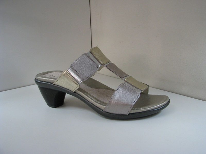 1.5 inch stacked heel. Rubber sole. Comfort insole. Slide. Open toe. European whole sizes. Multi metallic leather & material.