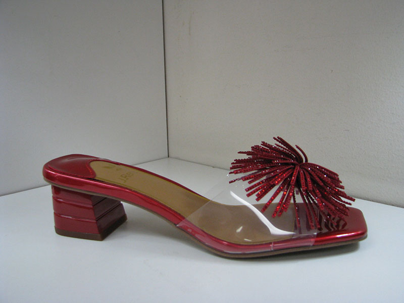 1.25 inch heel. Slide. Open toe. Composition non slip sole. Medium width. Whole & half sizes. Clear Vinyl vamp. Clear vinyl with red patent and a red adornment.