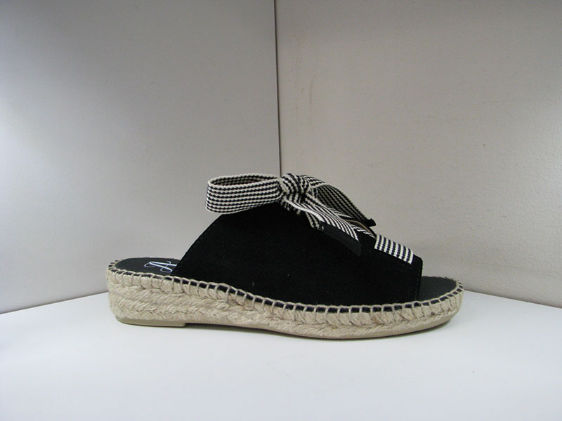 1.25 inch rope wedge. Rubber sole. Open toe slide. Cushion leather insole. Whole European sizes. Black suede adorned with a black and white fabric lace bow.
