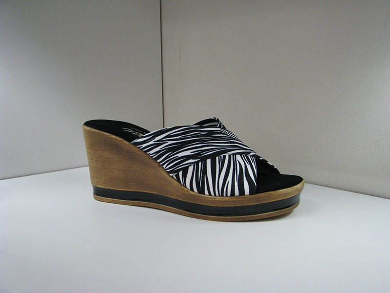 2.5 inch wedge heel. Open toe slide. Suede comfort insole. Composition sole. Medium Widths. Whole sizes. Black and white zebra fabric.
