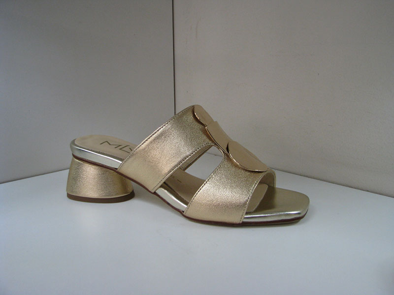 1.5 inch open toe slide. Non slip sole. Medium width. Whole European sizes. Gold Leather.