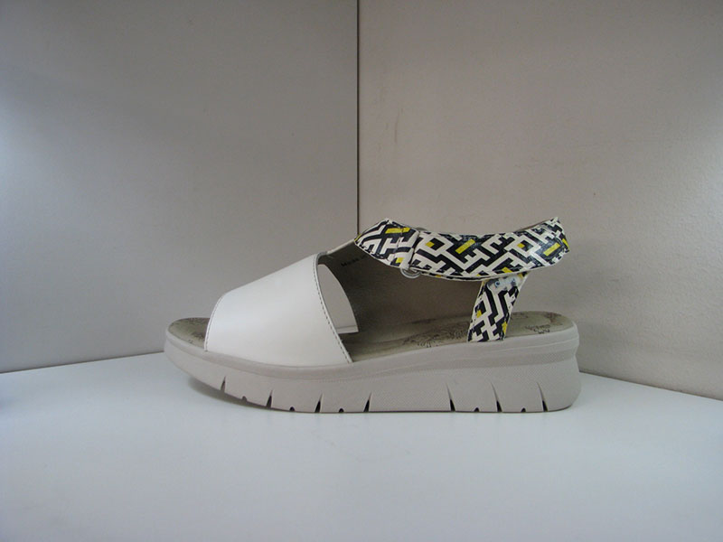 .75 inch wedge heel. Rubber sole. Open toe. Adjustable heel strap. Cushion insole. Whole European sizes. Medium width. Bone leather with black and yellow printed leather.