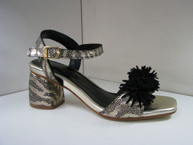 2 inch heel, open toe sandal with adjustable ankle strap. Cushion insole. Nonslip outsole. Medium width. Whole European sizes. Black and gold leather.